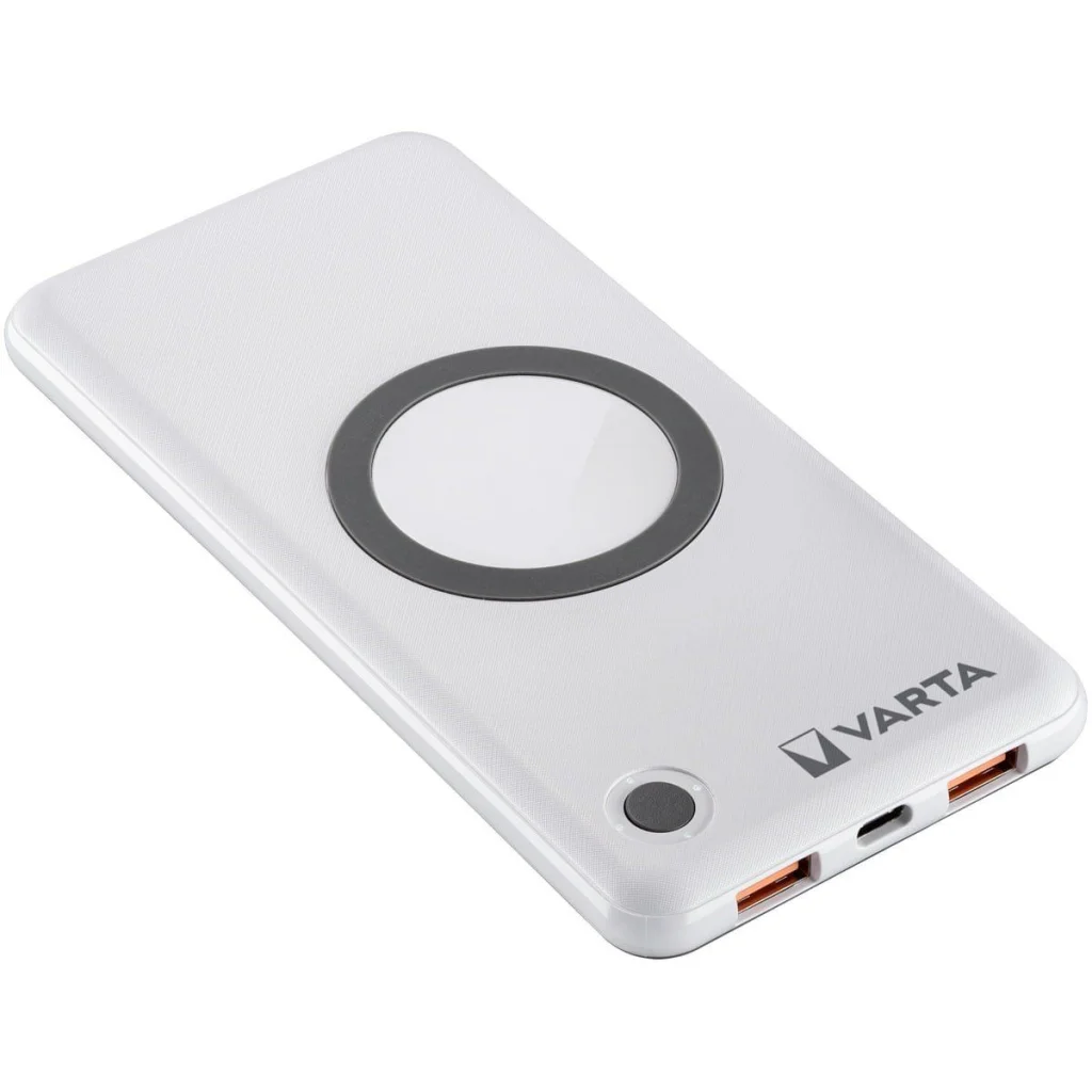 Varta powerbank 20000mAh kapacitással, vezeték nélküli töltéssel és két kimenettel akár két eszköz egyidejű töltéséhez. A powerbank két USB-kimenetet és egy USB-C-t kínál, amely a powerbank töltésére is szolgál. A körrel jelölt helyen találsz vezeték nélküli töltőt, csak helyezd rá a vezeték nélküli töltés funkcióval ellátott telefonodat és már indul is a töltés. Mindkét USB-port 18 W-os töltési teljesítménnyel rendelkezik. Az USB-C ugyanolyan töltési kapacitással rendelkezik, és a power bank töltésére is szolgál. Itt egy LED-es jelzést is talál, amely mind a powerbank töltését, mind a powerbank töltés közbeni állapotát jelzi.