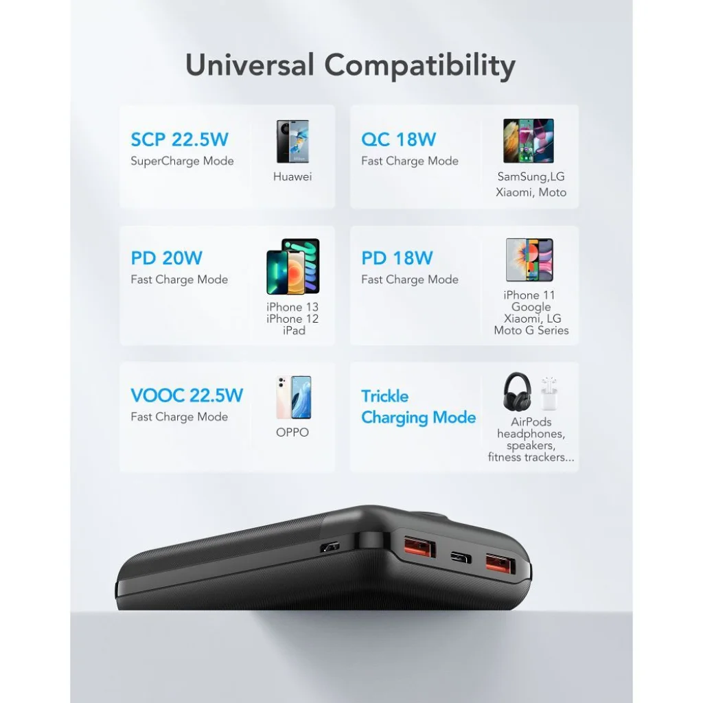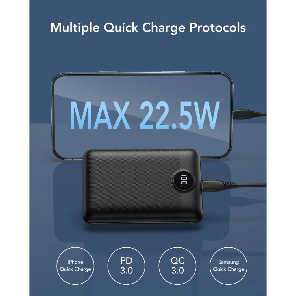 A powerbank a legmodernebb Power Delivery (PD 20W az USB-C porton keresztül) és Quick Charge 3.0 technológiákat ötvözi, maximum 22.5W teljesítménnyel. Ennek köszönhetően számos eszközt tölthetsz extrém gyorsasággal: