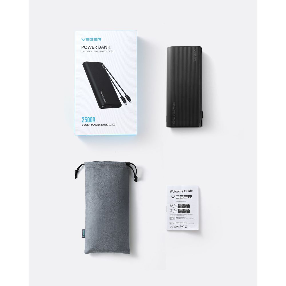 A Veger TCE130 (W2503) 25 000 mAh kapacitású power bank a tökéletes társ utazásokhoz és a mindennapi használathoz, garantálja eszközeid gyors és megbízható töltését bárhol és bármikor. Kivételes, 130W-os teljesítményével és beépített kábeleivel a legmodernebb töltési megoldást kínálja egy kompakt, utazásbarát kialakításban.