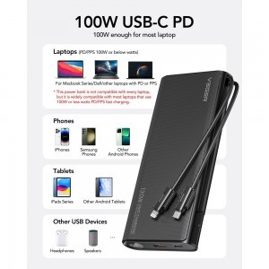 - Laptopok: A 100W USB-C PD kimenet a legtöbb laptopot képes tölteni, beleértve a MacBook, Dell sorozatot és más, PD vagy PPS töltést támogató modelleket (max. 100W). Fontos megjegyezni, hogy bár nem minden laptoppal kompatibilis, széles körben használható azokkal, amelyek 100W vagy annál kevesebb PD/PPS gyorstöltést használnak.