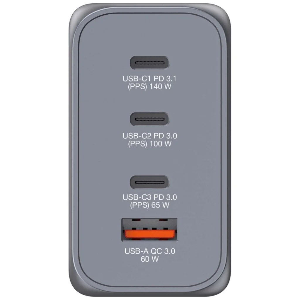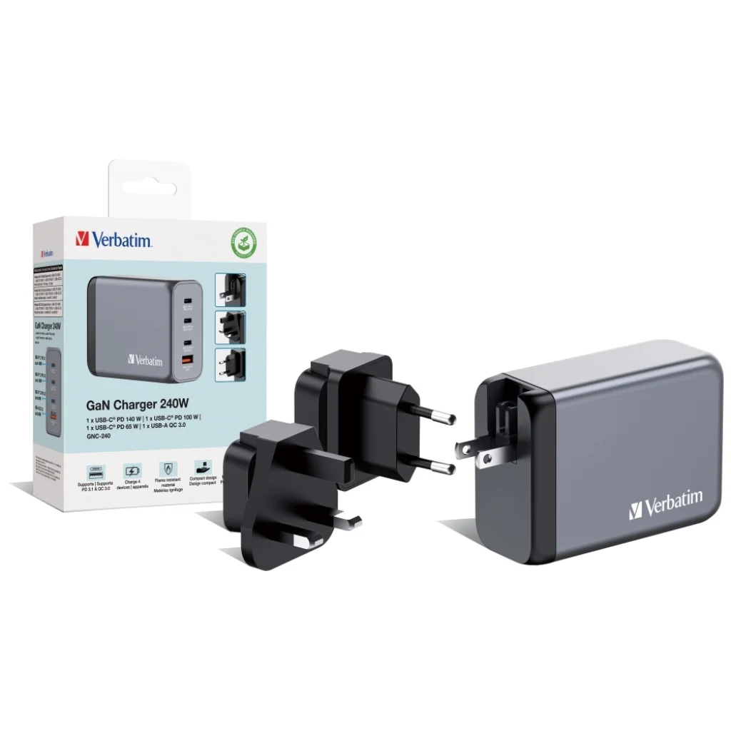 A Verbatim 240W GaN Fali Töltő egyesíti az egyik USB-C PD 140W portot, az egyik USB-C PD 100W portot, az egyik USB-C PD 65W portot és egy USB-A QC 3.0 portot egy elegáns, tenyérnyi méretű kivitelben. Ideális az irodában, otthon vagy utazás közben, hiszen képes laptop, tablet, okostelefon, játékeszközök és még sok más eszköz töltésére. Összecsukható amerikai dugókkal és cserélhető EU és UK változatokkal rendelkezik, így a legjobb utazó társ. GaN (Gallium Nitride) technológiával rendelkezik, amely gyors és hatékony nagy teljesítményű töltést biztosít, miközben kevesebb hőt termel. A GaN töltők kisebbek és könnyebbek, mint a hagyományos szilícium alapú töltők, így nagyon könnyen szállíthatók és ideálisak utazáshoz. A GaN töltő kiváló minőségű, tűzálló anyagokból készült, és négy biztonsági rendszert tartalmaz, beleértve a túlfeszültség védelmet, a túláram védelmet, a rövidzárlat védelmet és a túlmelegedés védelmet. Támogatja akár 4 eszköz egyidejű töltését, és a beépített GaN technológia hatékonyabb és kevesebb hőtermeléssel járó töltést biztosít. Kiváló utazó társ összecsukható amerikai dugókkal és cserélhető EU és UK adapterekkel, karcsú, kompakt kivitelével. Támogatja az USB Power Delivery 3.1 és 3.0, PPS, és Quick Charge 3.0 szupergyors töltést. A PPS (Programozható Tápegység) technológia biztosítja az optimális töltéshez szükséges megfelelő teljesítménymennyiséget. Magas minőségű tűzálló anyagokból készült, és négy biztonsági rendszerrel van felszerelve, amelyek túlfeszültség, túláram, rövidzárlat és túlmelegedés elleni védelmet nyújtanak. Maximális teljes kimeneti teljesítmény: 240W. Színek: Fekete.