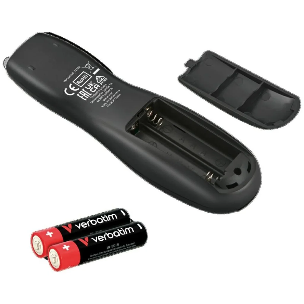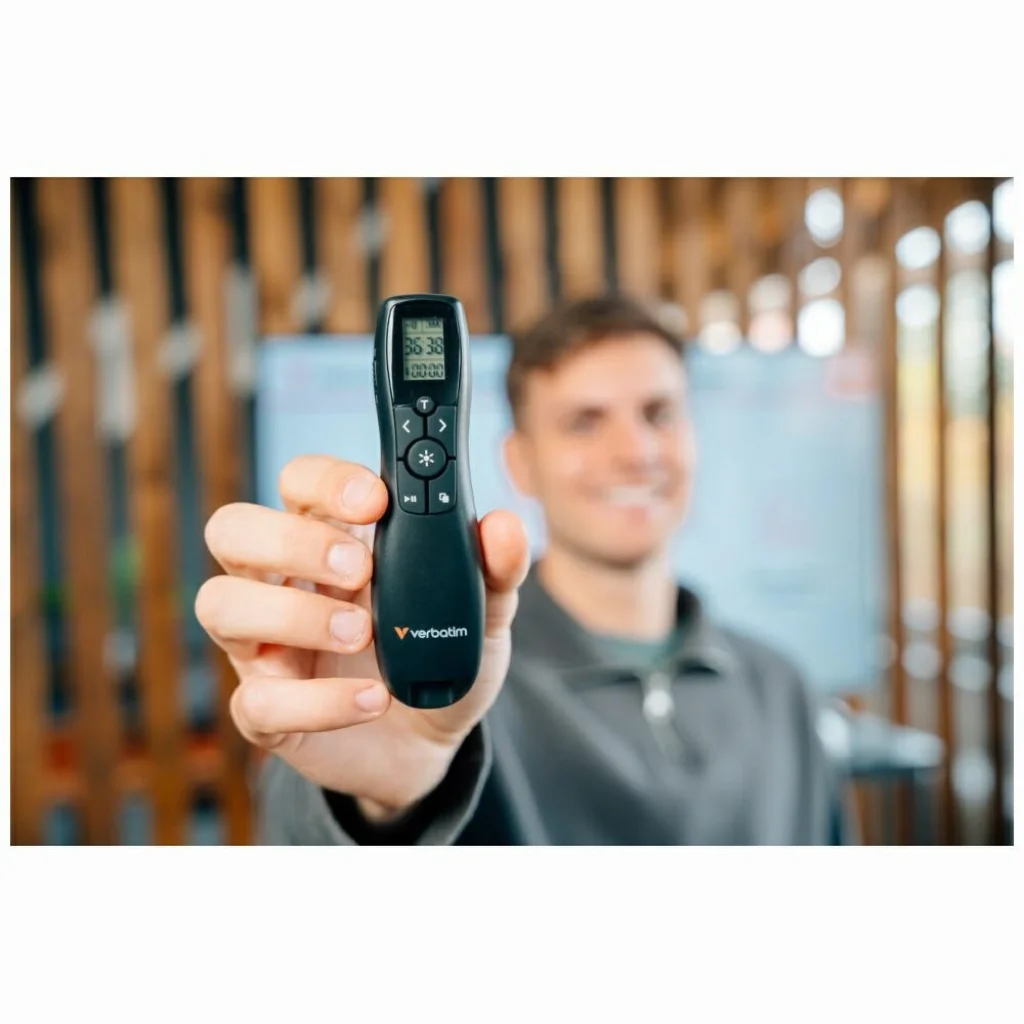 A Verbatim Keynot prezenter lézer pointerrel olyan felhasználók számára készült, akik teljes kontrollra vágynak a prezentációjuk felett, megbízhatóságot és professzionális megjelenést igényelnek. Tökéletesen működik üzleti megbeszélések, képzések, konferenciák és előadások során, ahol fontos a gördülékeny előadás és a szabad mozgás a teremben. A készülék lehetővé teszi a vezeték nélküli diákszabályozást, így az előadó a mondanivalóra összpontosíthat a számítógép kezelése helyett. A beépített piros lézer pointer segítségével könnyű és egyértelmű a közönség figyelmét a prezentáció legfontosabb elemeire, például diagramokra, számadatokra vagy kulcsfontosságú diákrészekre irányítani. A működési hatótávolság kényelmes használatot biztosít még nagyobb termekben is. A prezenter plug & play technológiával működik – a miniatűr USB vevő csatlakoztatása után azonnal használatra kész, további illesztőprogramok telepítése nélkül. Ez a megoldás széleskörű kompatibilitást biztosít a népszerű operációs rendszerekkel és prezentációs szoftverekkel, így univerzális eszköz mind irodai, mind oktatási használatra. A karcsú és ergonomikus kialakítást úgy tervezték, hogy a készülék kényelmesen illeszkedjen a kézbe még hosszabb prezentációk alatt is. A klasszikus fekete szín kiemeli a prezenter professzionális jellegét, így tökéletesen illeszkedik az üzleti környezetekhez. Kompakt mérete megkönnyíti a tárolást és a szállítást, így mindig kéznél tartható – egy laptop táskában vagy aktatáskában. A Verbatim Keynot prezenter a Verbatim termékek funkcionalitásának, könnyű használatának és szilárd felépítési minőségének tökéletes kombinációja. Megbízható támogatás azok számára, akik professzionális, magabiztos és jól megszervezett prezentációt szeretnének tartani.