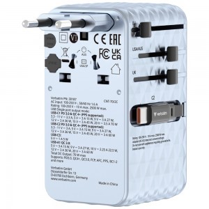 Töltsön akár hat eszközt egyidejűleg a Verbatim GaN III univerzális utazási adapterrel. A készülék egy AC aljzatot, USA/JP aljzatot, USB-C portot, USB-A portot és két visszahúzható USB-C kábelt kínál, összesen akár 70 W teljes teljesítménnyel. Az USB-C PD 3.0 és QC 4+ szabványok lehetővé teszik a töltést akár 70 W teljesítménnyel, míg az USB-A QC 4+ 60 W-ig támogatja a töltést. GaN TECHNOLÓGIA biztosítja a hatékony töltést és csökkenti a hőtermelést.
