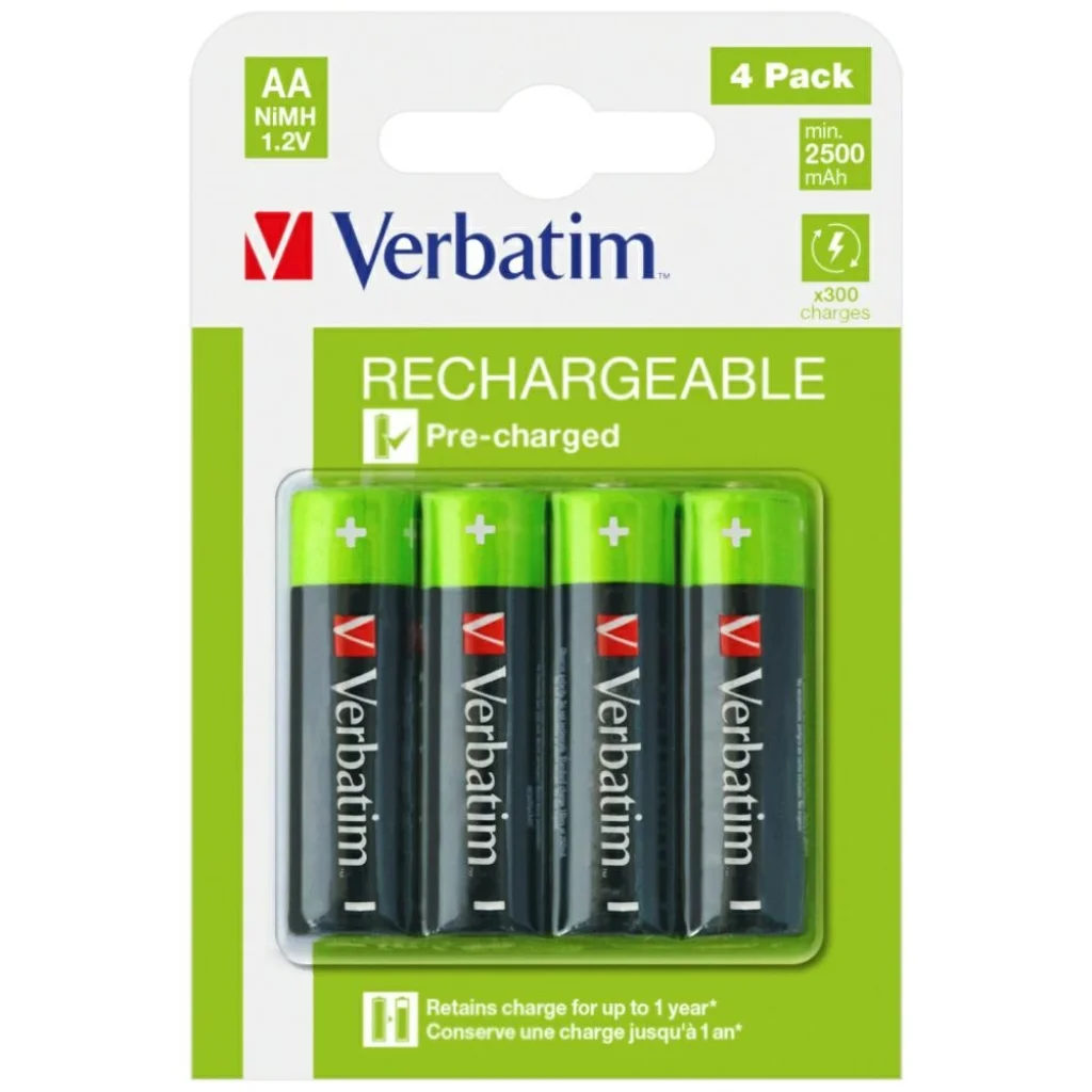 A Verbatim újratölthető akkumulátorok körülbelül 300 alkalommal tölthetők újra és használhatók. Tökéletesek nagy energiaigényű eszközökhöz. Az akkumulátorok előre feltöltöttek és megtartják töltöttségüket akár 1 évig is!