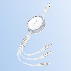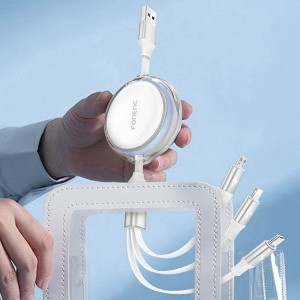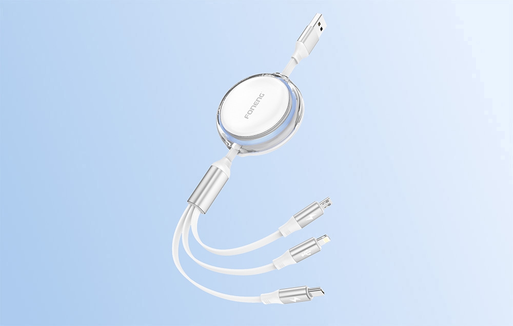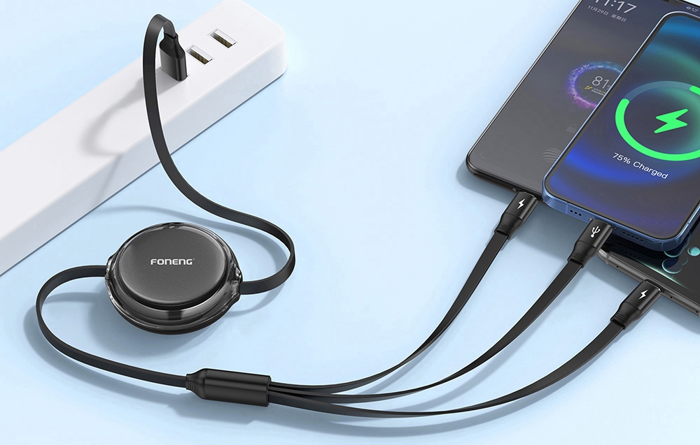 A Foneng X113 kábel teleszkópos, kétfokozatú kialakítással rendelkezik, amely kényelmes skálázást biztosít mindkét irányban. Ez lehetővé teszi, hogy a kábelt az Ön igényei szerint állítsa be, optimális hosszúságot és kényelmet biztosítva. Támogatja három különböző interfésszel rendelkező készülékek töltését: Micro (2,1A), Lightning (2,4A) és Type-C (3A), adatátvitelt is biztosítva, így ideális azok számára, akik sebességet és funkcionalitást keresnek egyben.