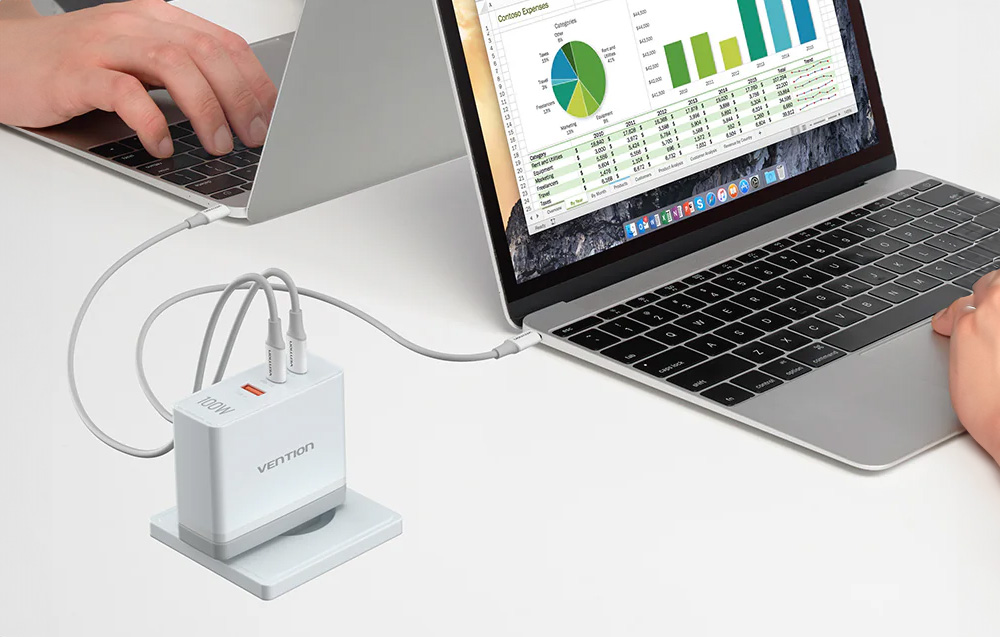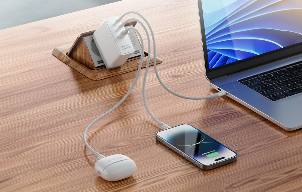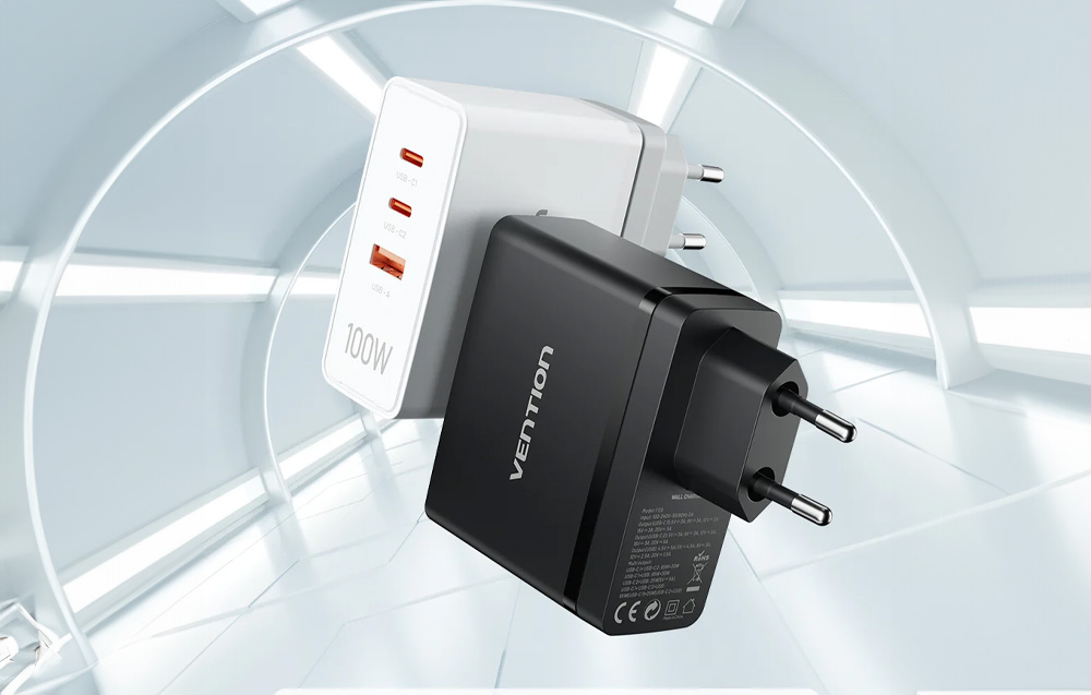 Most akár 3 eszközt is feltölthet egyszerre rövid idő alatt. A Vention FEGW0-EU töltő 3 portot (2x USB-C, 1x USB-A) kínál, legfeljebb 100 watt teljesítményt nyújt, és számos gyors töltési szabványt támogat. Közben kifejezetten praktikus és tartós. Fejlett GaN technológiát alkalmaz, hogy hatékony és biztonságos működést biztosítson.