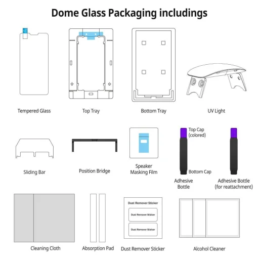 Csomag tartalma: 1x Üvegfólia, 1x UV lámpa, 1x felhelyezési eszközök.