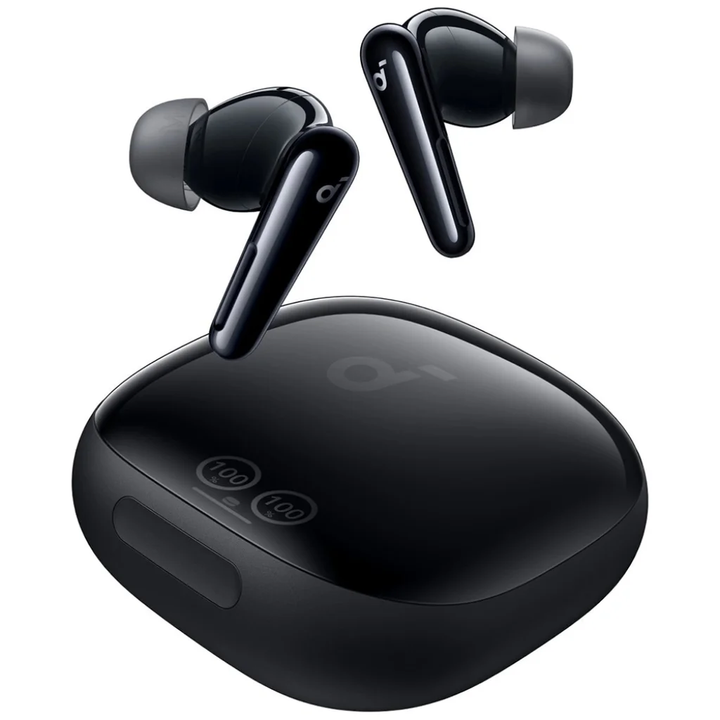 A SoundCore Liberty 4 Pro NC fényes fekete kivitelével modern és stílusos megjelenést kölcsönöz. Az ergonomikus kialakításnak köszönhetően kényelmesen illeszkedik a fülbe, hosszú órákon át tartó viselés esetén is. A kompakt töltőtok nemcsak védi a fülhallgatókat, hanem extra üzemidőt is biztosít. A tokon található digitális kijelzők segítségével könnyedén ellenőrizheti a fülhallgatók akkumulátorának töltöttségi szintjét, így sosem éri meglepetés.