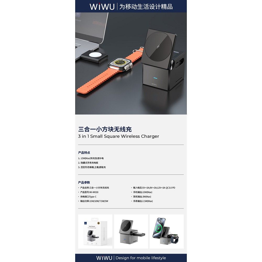 Összecsukható vezeték nélküli töltő WiWU Wi-W030 3in1. Lehetővé teszi egy telefon, okosóra, TWS fülhallgató induktív töltését. Támogatja a MagSafe töltést. Olyan eszközökhöz tervezve, amelyek teljesítményigénye akár 15 W. Töltsön több eszközt egyetlen kiegészítővel! A Hoco töltő lehetővé teszi akár háromféle eszköz egyidejű induktív töltését: telefonok, TWS fülhallgatók, okosórák. Ennek köszönhetően sok helyet megspórolhat, hiszen csak egyetlen kiegészítőt használhat ezeknek az eszközöknek a táplálására. A termék alumíniumötvözetből és PC-ből készült, ellenáll a sérüléseknek és kényelmes munkát biztosít. Támogatja a MagSafe töltést. Összecsukható, ami megkönnyíti a szállítást.