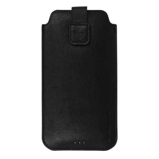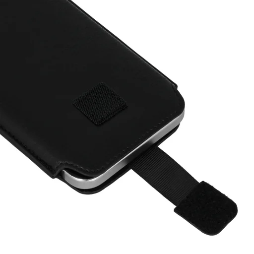 A telefon a tok tetejéről csúsztatható be, és a tépőzáras záródás megakadályozza, hogy kieszen. A tok belsejében található PULL-UP pánt lehetővé teszi, hogy gyorsan és egyszerűen kihúzza telefonját. A csat dombornyomott logója elegáns megjelenést kölcsönöz.
