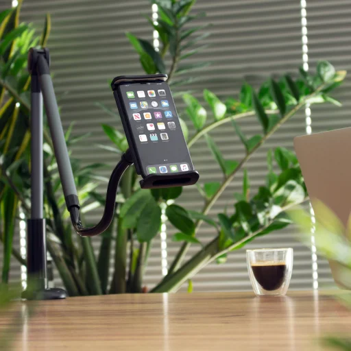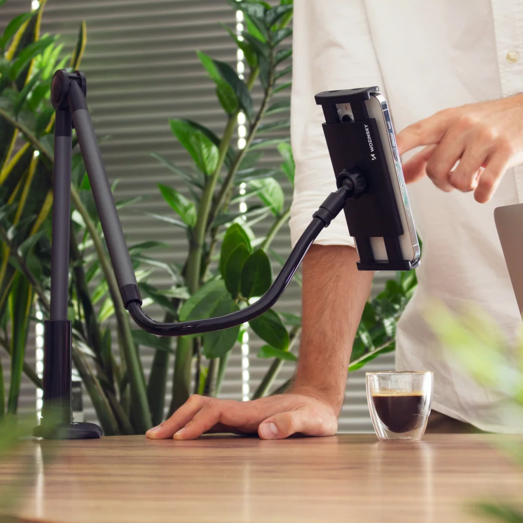A flexibilis Wozinsky WTHBK5 telefon- vagy táblagéptartó könnyen beállítható bármilyen pozícióba: a rugalmas karnak köszönhetően bármilyen irányba elforgathatja.