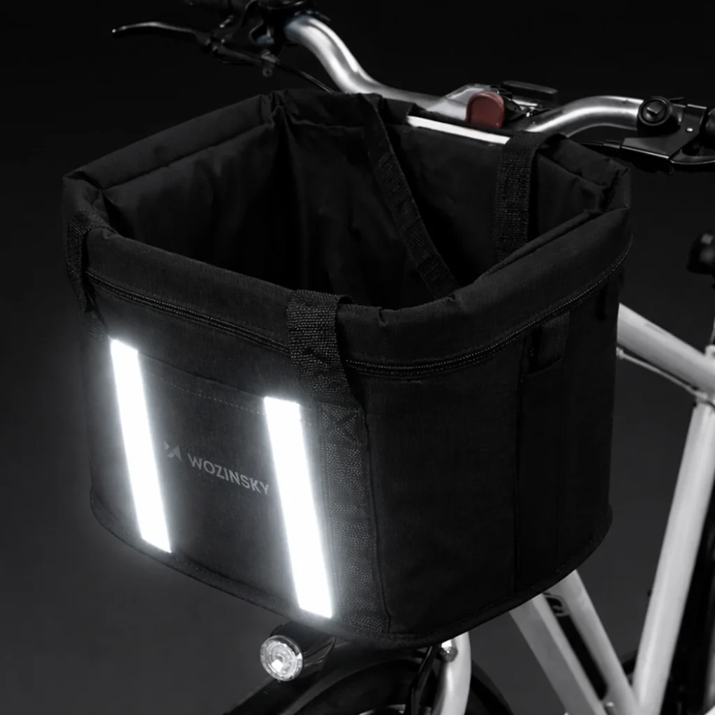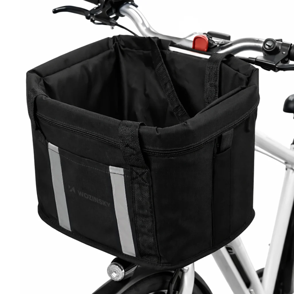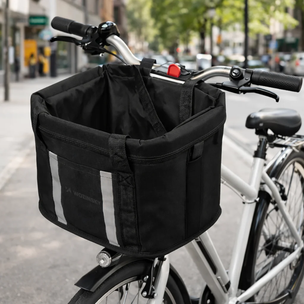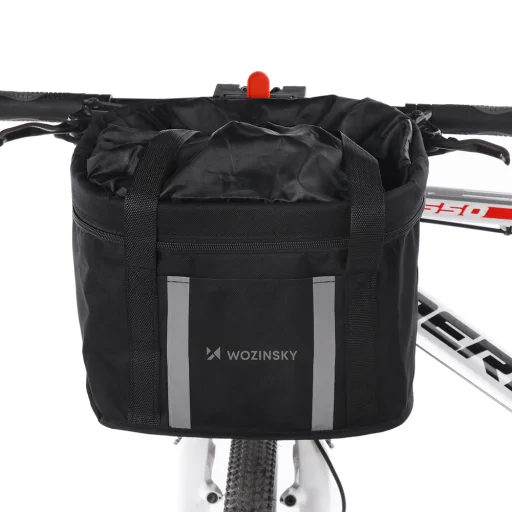 Wozinsky WKR-MK szövet kormányra szerelhető kerékpár kosár - fekete A Wozinsky WKR-MK kerékpár kosár funkcionalitásával ideális megoldást nyújt mindazok számára, akik kényelmesen szeretnék szállítani szükséges dolgaikat biciklizés közben. Könnyű szövet kialakításának köszönhetően gyakorlatilag használható kerékpáron és azon kívül is. Gyorsan rögzíthető a kormányra, és zsinórral zárható fedele van, ami lehetővé teszi az élelmiszerek vagy mindennapi kiegészítők biztonságos szállítását. Kényelmes választás városi túrákhoz és rövid utakhoz.