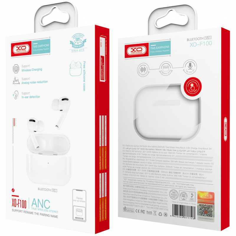 XO Design F100 Vezeték nélküli fülhallgató A F100 vezeték nélküli fülhallgató stabil kapcsolatot biztosít a Bluetooth v5.0 technológiának köszönhetően, és az Aktív zajszűrés (ANC) segít abban, hogy tiszta és érthető telefonbeszélgetéseket folytass. Specifikációk:
