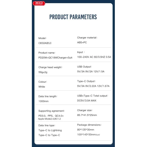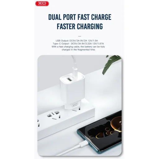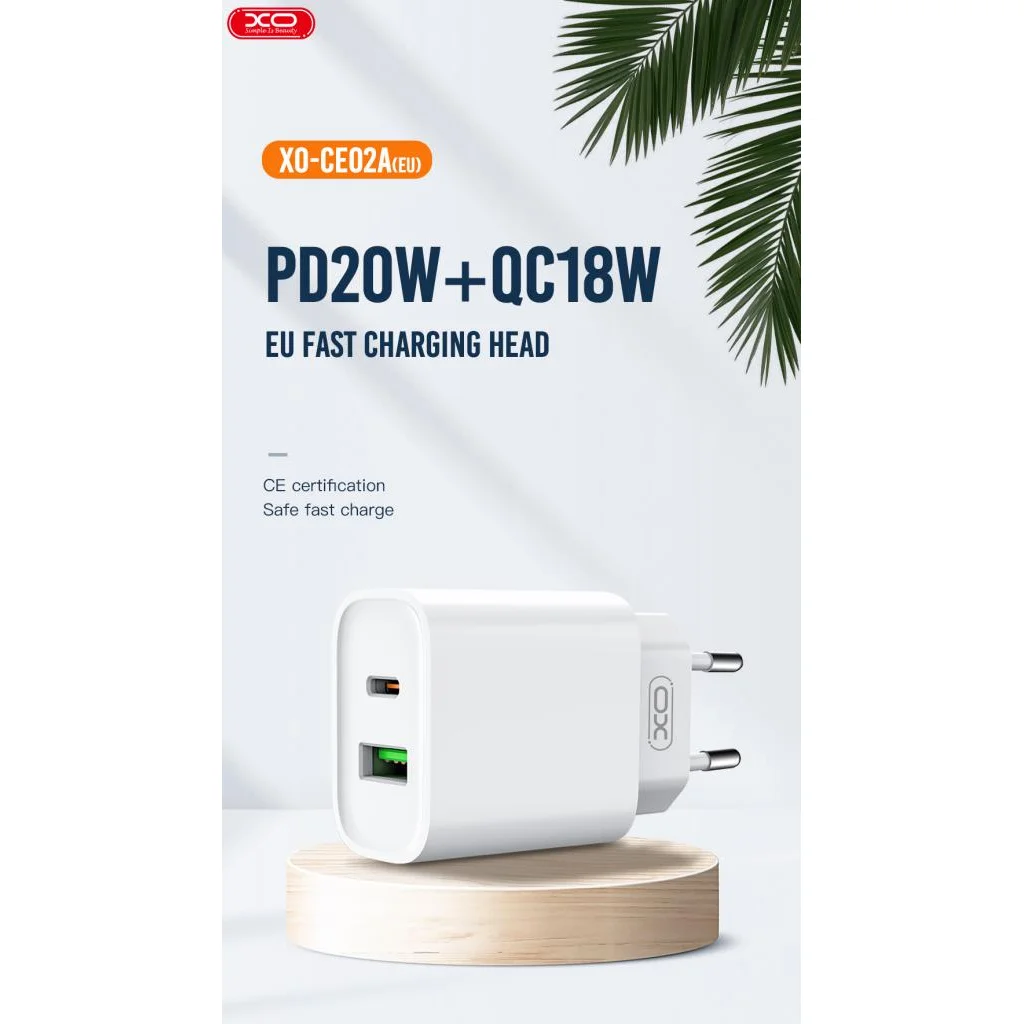 XO hálózati töltő adapter CE02A PD 20W QC 3.0 18W 1x USB 1x USB-C fehér + USB-C – USB-C kábel