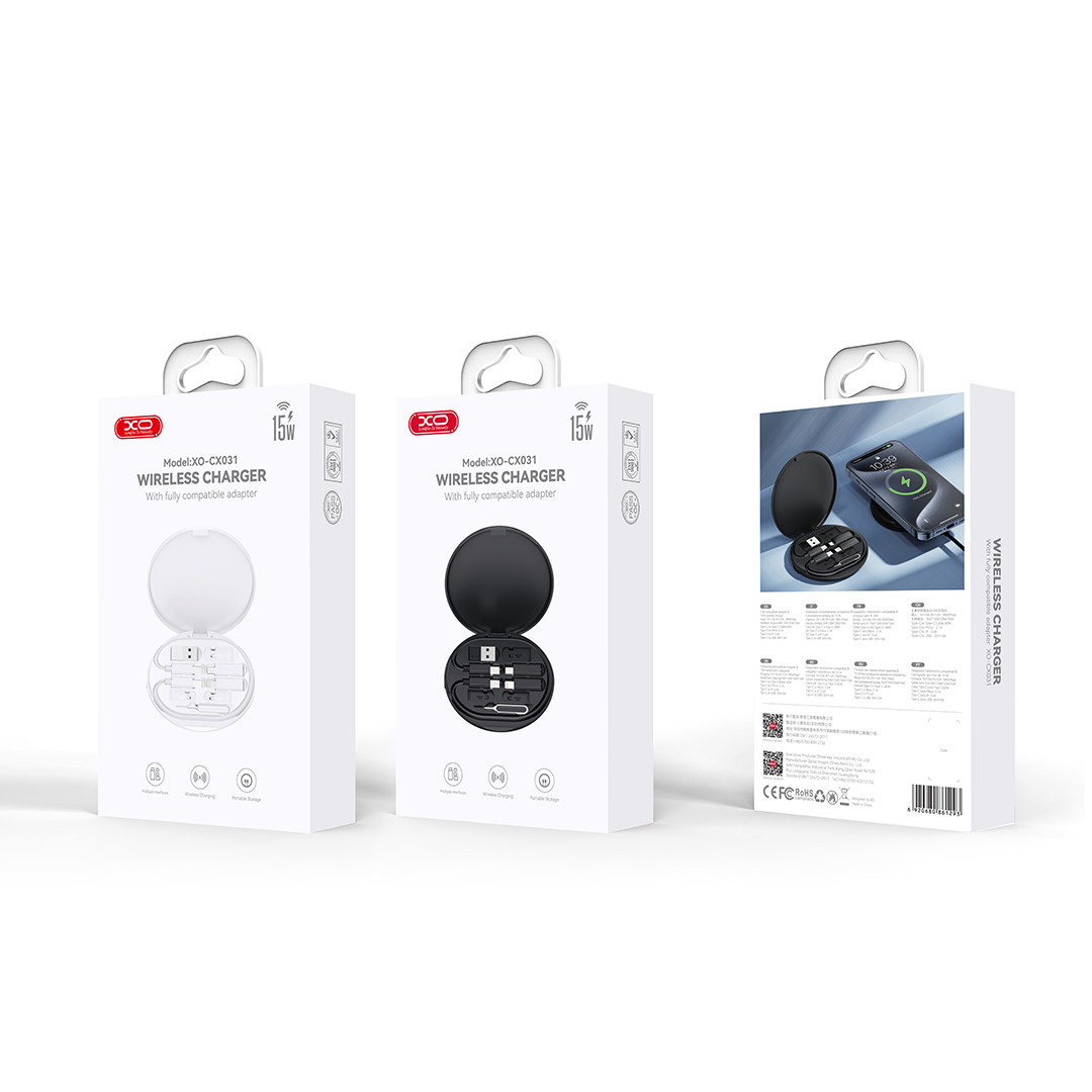 Az XO CX031 egy 15W-os vezeték nélküli indukciós töltő, amely a QI technológiával működik, és okostelefonok töltésére készült, kiegészítő adapterkészlettel. Egyszerűen helyezze okostelefonját a padra, és a töltő automatikusan elkezdi tölteni. Tökéletes otthoni vagy irodai használatra. A legmagasabb töltési teljesítmény eléréséhez ajánlott a QC 2.0/QC 3.0 tápegység használata. A csomag további kábeleket is tartalmaz: USB-C - USB-C 60W, USB-C - USB-A adapter, USB-C - microUSB adapter és USB-C - Lightning adapter.