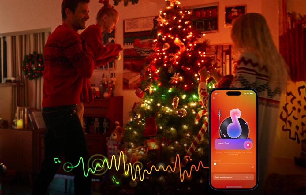 A Music Flow mód a fények a zene hangjaira reagálnak, így a hangokkal szinkronizált dinamikus fényhatásokat hozhat létre! Ez tökéletes az ünnepi partikhoz, családi énekléshez vagy a barátokkal töltött estékhez.