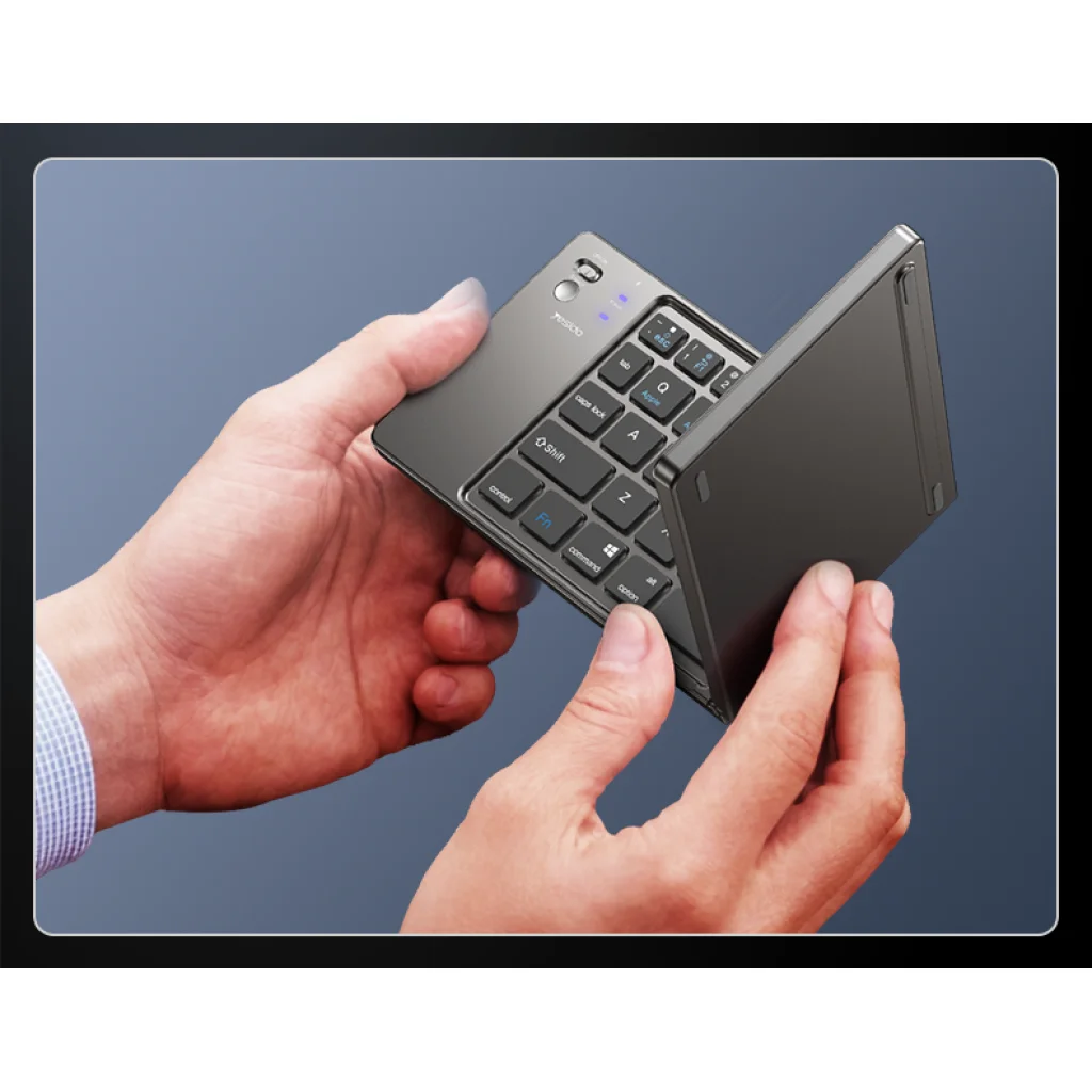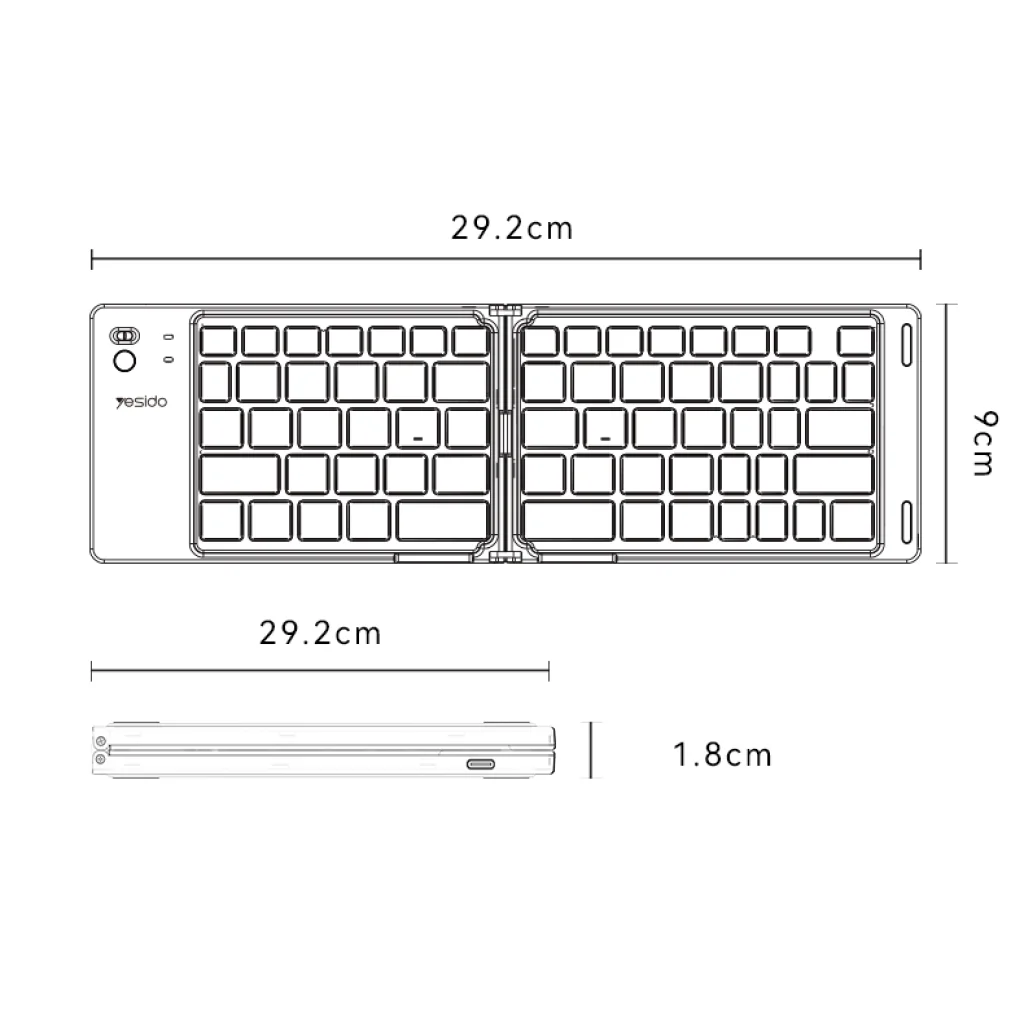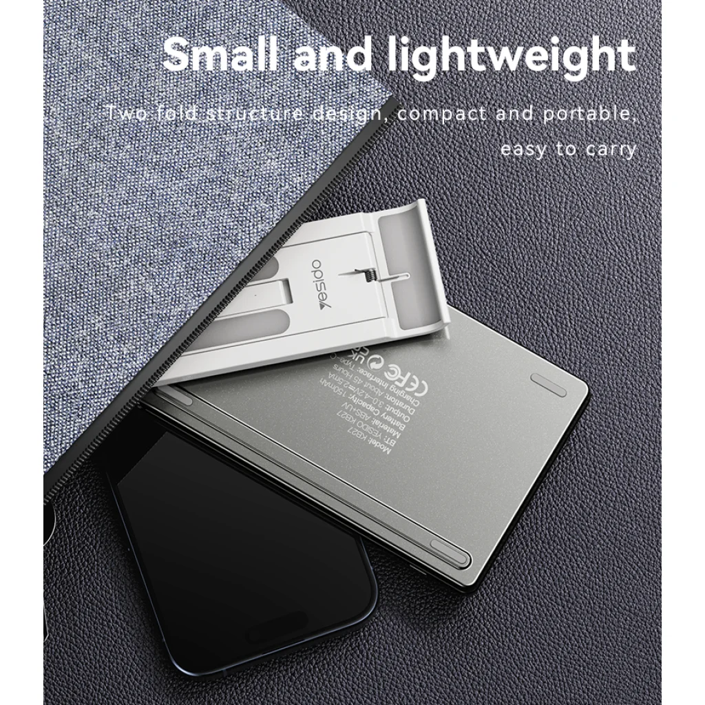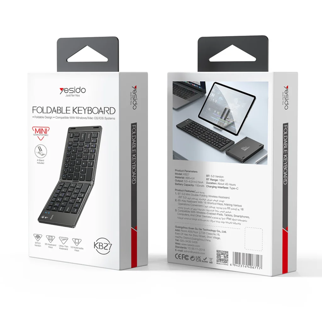- Zsebben elférő hordozhatóság: Az innovatív, kettős hajtású mechanizmusnak köszönhetően a Yesido KB27 szinte hihetetlenül kompakt méretűre csukható össze. Könnyedén elfér a zsebedben, kisebb táskádban vagy akár egy irattárcában is, így bárhová magaddal viheted, és pillanatok alatt egy teljes értékű gépelési felületet varázsolhatsz elő, legyen szó utazásról, üzleti útról vagy egy kávézóban végzett munkáról.