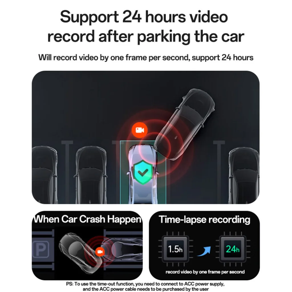 - 24 órás parkolási mód: A kamera támogatja a 24 órás parkolásfigyelést. Akár időeltolásos (time-lapse) felvétellel, mely másodpercenként egy képkockát rögzít, akár ütközés esetén induló felvétellel védi autóját. (Megjegyzés: Az időeltolásos funkció használatához ACC tápellátásra van szükség, melyhez a szükséges kábel külön vásárolható meg.)