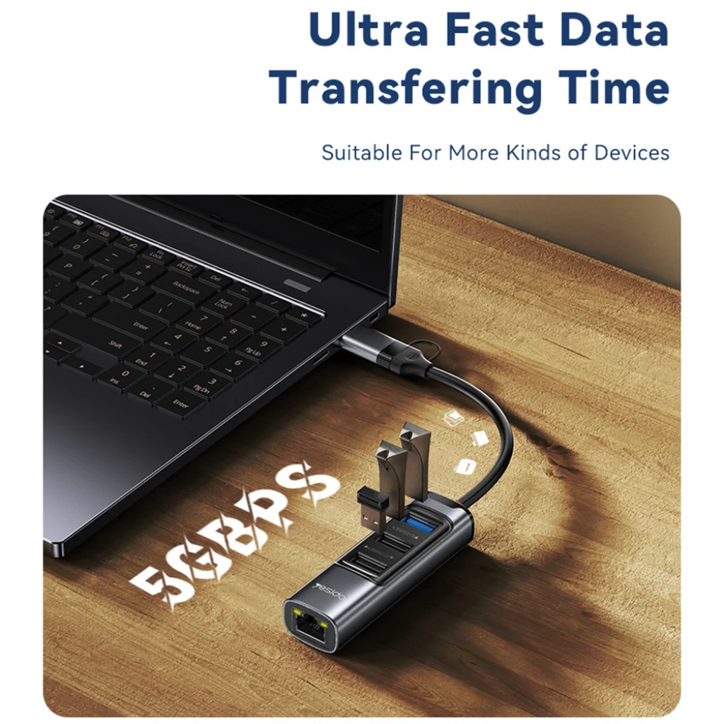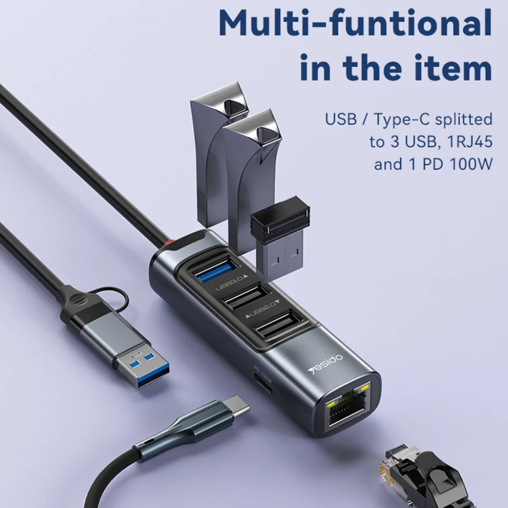 A Yesido HB21 kiemelkedik a piacon egyedülálló, dual-ended USB és Type-C bemeneti kábelével. Ez azt jelenti, hogy könnyedén csatlakoztatható bármilyen USB-A vagy USB-C porttal rendelkező laptophoz vagy eszközhöz, maximális kompatibilitást biztosítva. Az egyetlen bemeneti portból öt hasznos kimeneti portot varázsol: