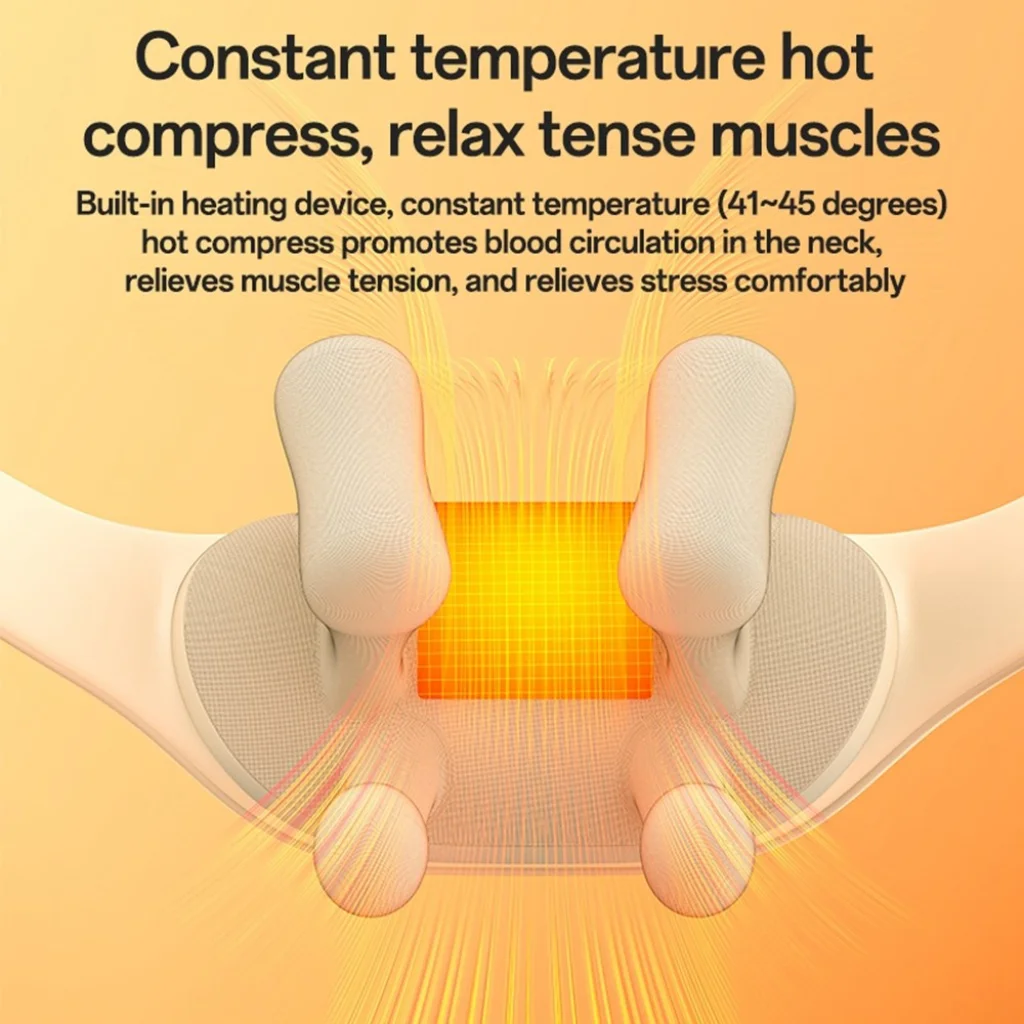 - Nyugtató hőterápia: beépített fűtőberendezés, amely állandó 41-45°C-os hőmérsékleten működik. Ez a melegítés elősegíti a vérkeringést a nyakban és a vállakban, enyhíti az izomfeszültséget és kényelmesen oldja a stresszt. A hőenergia mélyen behatol a szövetekbe, gyorsítja az izmok regenerálódását és alaposabb ellazulást biztosít.