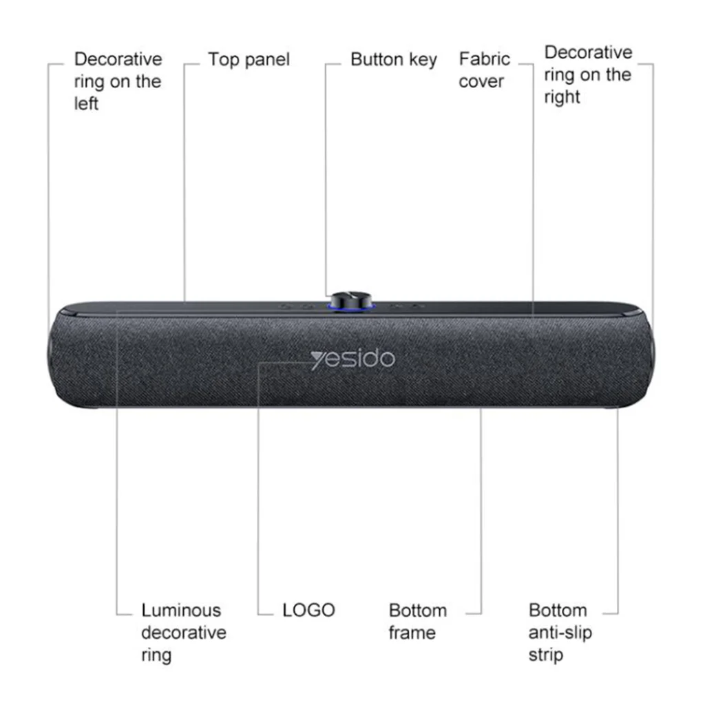 A Yesido YSW42 nemcsak hangzásában, hanem megjelenésében is prémium minőséget képvisel. Az elegáns szövetborítás és a tartós ABS anyagok modern és letisztult külsőt kölcsönöznek a készüléknek. A felső panelen található intuitív forgatógombbal könnyedén állítható a hangerő, és a további gombok segítségével válthat módot vagy léptethet számokat. A hangerőszabályzó gomb körül elhelyezkedő világító díszgyűrű nemcsak esztétikus kiegészítő, hanem egyedivé teszi az eszközt. A hangszóró kompakt méreteinek (42 x 7.8 x 7.0 cm) köszönhetően könnyen hordozható és stabilan elhelyezhető, amit az alján található csúszásgátló csíkok is garantálnak.