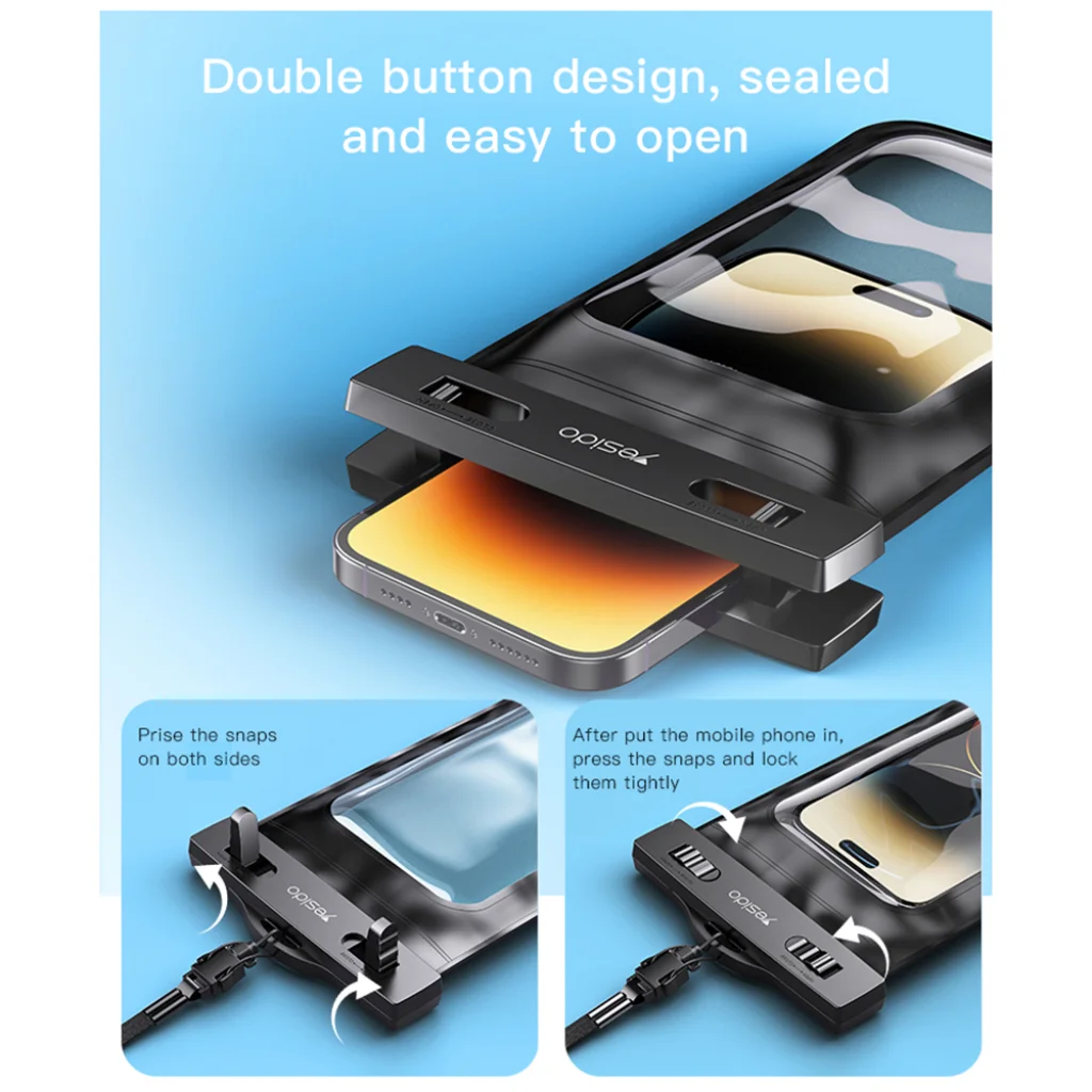 A Yesido WB10 innovatív, kettős gombos zárrendszerrel rendelkezik, amely megbízhatóan zárja le a tokot, miközben rendkívül egyszerű a nyitása és zárása. Egyszerűen helyezze be a telefont, nyomja össze mindkét oldalon a kapcsokat, és máris biztonságban van készüléke. Ez a precíz kialakítás maximális védelmet nyújt a víz és por ellen.