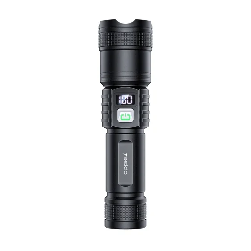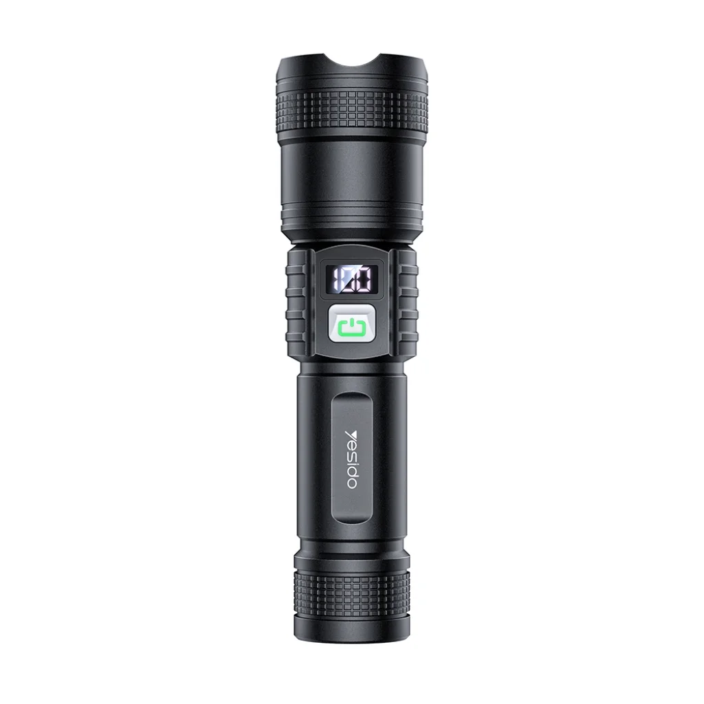Yesido - Zseblámpa (TC11) - Teleszkópos Zoom, Fehér Lézer LED, 3x Módok, Újratölthető, Digitális Kijelző, 3W, 1200mAh - Fekete