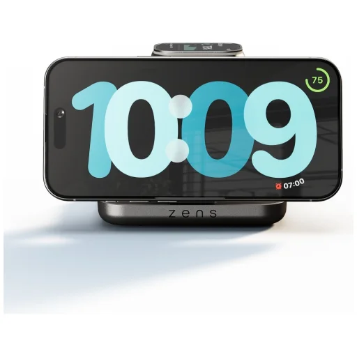 A Zens Nightstand Charger Pro 2 mágneses 2 az 1-ben vezeték nélküli töltő modern megoldás a kényelmes töltéshez és a rendezett éjjeliszekrényhez. Lehetővé teszi egyidejűleg egy iPhone (12-es szériától kezdve) és egy Apple Watch töltését, így nincs szükség több kábelre és töltőre. A mágneses illesztésnek köszönhetően az eszköz automatikusan az optimális pozícióba igazítja az okostelefont, stabil és hatékony, akár 15 W-os töltést biztosítva.