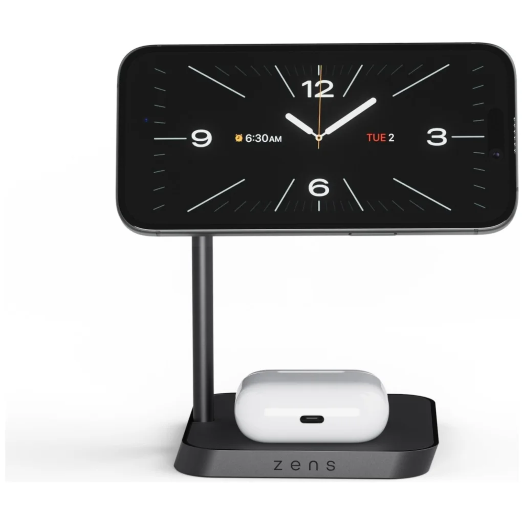A Zens Office Charger 2 Qi 2 az 1-ben mágneses indukciós töltő elegáns és praktikus megoldás modern munkakörnyezethez. Lehetővé teszi két eszköz egyidejű töltését – egy okostelefonét és egy fülhallgatóét –, így segít megszüntetni a kábelrendetlenséget az íróasztalon. A mágneses rögzítés pontosan igazítja az iPhone-t (a 12-es szériától) vagy a mágneses tokkal használt okostelefont, így a töltés álló és fekvő helyzetben is lehetséges. Az alsó töltőfelület fülhallgatók vagy más Qi-kompatibilis eszközök töltésére szolgál.
